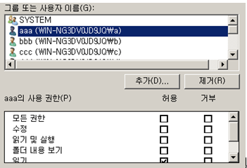 이 폴더에만 접근하기 위한 사용권한으로 사용자들을 추가해준 후 각각의 사용자에게 권한을 줄 수 있다. admin에서는 자신을 제외한 각각의 팀장에는 읽기권한만 주고 자신의 부서의 팀장은 읽기,쓰기 팀원들은 읽기만 설정해 준다.