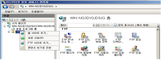 FTP란 File Transfer Protocol의 약자로 TCP/IP 프로토콜을 통해 서버와 클라이언트 간에 파일을 전송하기 위한 프로토콜이다. 다시 말해서 네트워크에 연결된 컴퓨터끼리 데이터를 원활하게 교환하기 위한 목적으로 개발되었다. FTP에는 제어 채널과 전송 채널이 있다. 전송 채널은 20번(FTP-data-port) 포트를 사용하고 제어 채널은 21번(FTP-port)포트를 사용한다. ftp도 역시 iis에서 설치한다. ftp 사이트 추가를 선택한다.