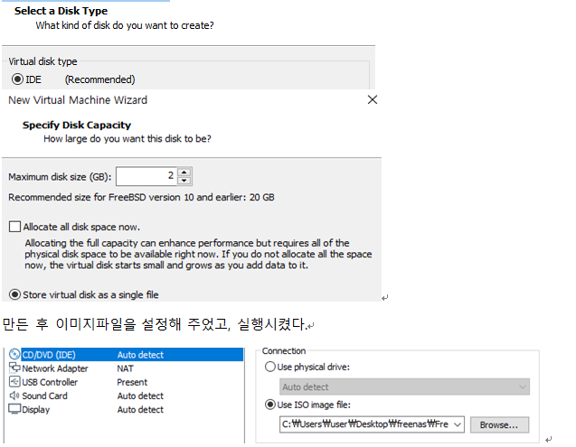 먼저 freenas라는 가상머신을 만들어 주겠다. 메모리는 512mb로 크기는 2GB로 하겠다.