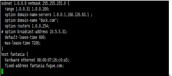 필요한 부분만 남기고 설정했다, ip는 1.0.0.0/24대역 , 사용가능한 범위를 31 ~ 200으로 도메인 ip는 1.0.0.1, 168.126.63.1, 도메인 네임은 duck.com으로 router는 1.0.0.254로 했다.