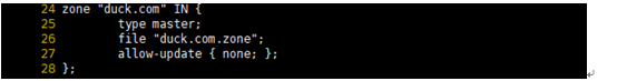 도메인에 실제이름 지정을 위해 vi /etc/named.rfc1912.zones에서 설정해 주었다. 도메인은 duck.com으로 하겠다.