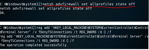 reg add "HKEY_LOCAL_MACHINE\SYSTEM\CurrentControlSet\Control\Terminal Server" /v fDenyTSConnections /t REG_DWORD /d 0 /f (원격데스크탑 설정)