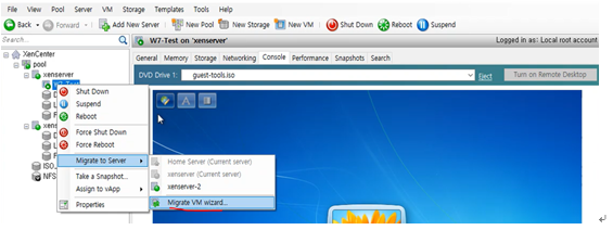 이제 xenserver에 있는 w7을 xenserver2로 migration 해보겠다.