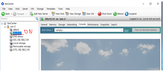 Xen –center에 복제된 win 10의 전원을 켜준다. (원본은 건들지 않는다. )