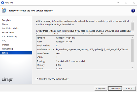 그 후 Xen center에서 새로운 VM추가한다. (WINDOW 10)
