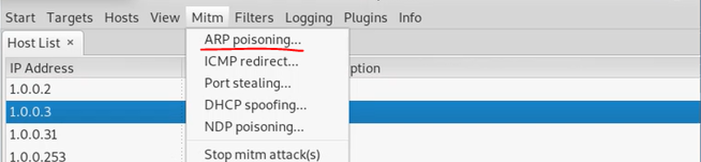 타겟을 지정한 후 arp값을 오염시킬 것이므로 arp poisoning 선택!