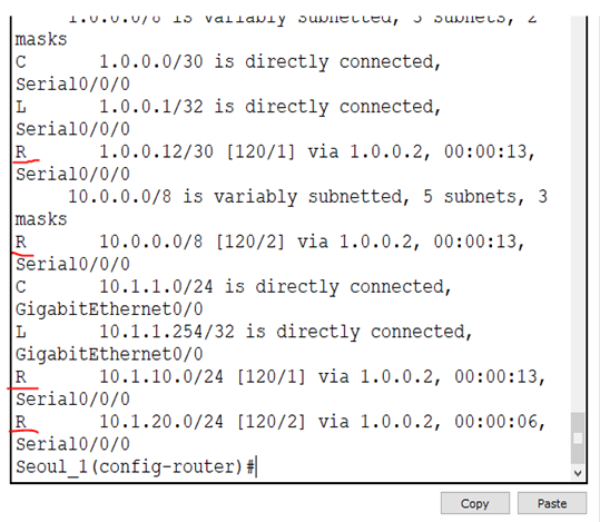 먼저 RIP에 대해 알아 보겠다. RIP는 방향만 계산하고, hop count를 metric으로 사용하여 최적 경로를 선택한다. 매 30초마다 Routing Update를 내보낸다. RIP에는 V1과 V2가 존재하는데 V2가 Classless하여서 저는 v2를 이용하였다. 먼저 똑같이 망을 구하였고, 역시pc와 server에 ip, subnetmask, gateway를 입력하고 라우터에는 기본명령어와 각 port에 ip을 대입하고, RIP을 통한ROUTER 경로 설정을 하였다. V2에서는 꼭 축약 방지를 위한 no auto-summary라는 명령어를 입력하여야 한다. V1은 classful하기떄문에 no auto-summary라는 명령어를 입력할 필요 없다.