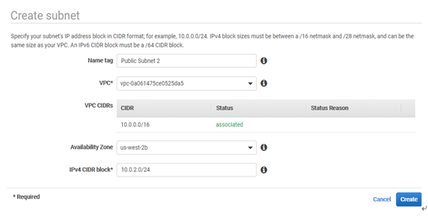 Public subnet을 만들겠다. 이름은 Public Subnet 2로 설정하고 VPC는 위에 만든 MY Lab VPC를 선택하면 무사히 CIDRs에 대역이 나온다. 가용 영역은 두번째인 2b를 선택하겠다. 대역은 10.0.2.0/24로 설정하고 생성한다