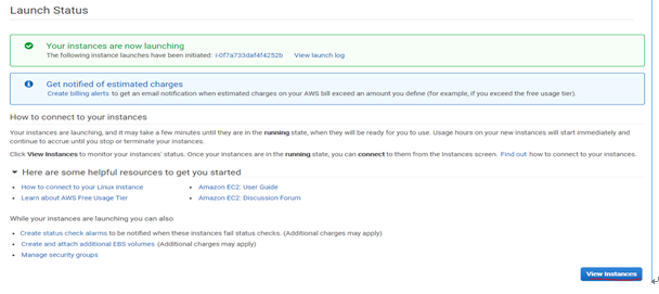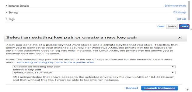 생성을 위해 Launch를 선택한 후 기존에 받았던 키페어을 사용한 후 인스턴스 시작!