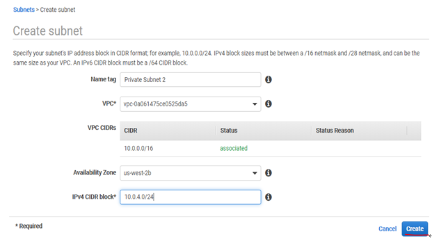 Private Subnet도 만들겠다. 이름은 Private Subnet으로 하고, 역시 VPC는 My Lab VPC를 선택한다. 가용영역도 두번째인 2b를 선택하고 대역을 10.0.4.0/24대역으로 설정하면 Pricate Subnet 설정이 끝이 난다.
