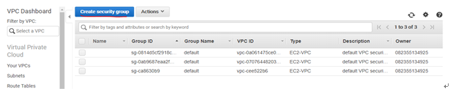 VPC 보안 그룹을 생성하겠다. 왼쪽 탐색 창에서 Security Groups를 선택 후 create클릭!