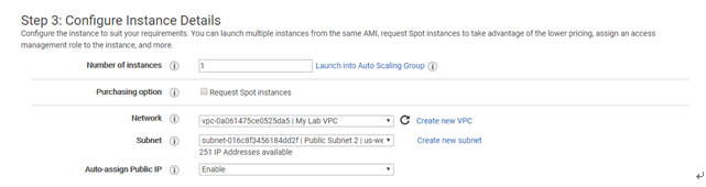 생성할 인스턴스 개수 선택하고 Network는 생성한 My Lab VPC를 선택하고 Subnet은 오른쪽 그림이므로 Public Subnet 2를 선택하고 공인 ip 할당은 enable로 한다.