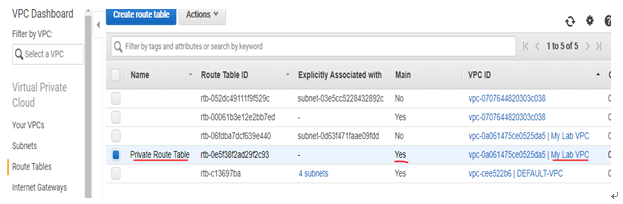 My Lab VPC에 Main에 yes로 되어있는 부분에 이름을 Private Route Table이라고 설정한다. 이름 설정은 Name 필드에 마우스를 올려놓으면 연필모양의 아이콘이 보인다. 이것을 클릭하고 체크모양을 클릭하여 저장하면 된다.