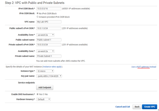 먼저 10.0.0.0/16대역을 갖는 VPC를 설정하고, 이름은 My Lab VPC로 하겠다. 다음 그림 왼쪽의 AZ설정을 위해 Pulbic subnet을 10.0.1.0/24대역으로 하고 가용영역을 첫번째 걸 선택한다.(2a) 이름은 Public Subnet 1으로 하겠다. Private subnet은 10.0.3.0/24d대역으로 하고 가용영역도 역시 첫번째 것으로 서로 같게 설정해줘야 한다.(2a) 이름은 Private Subnet 1으로 설정하겠다. NAT 인스턴스를 사용하기 위해 오른쪽에 Use NAT gateway instead를 선택하고 t2.micro로 설정하고 key pair 값을 선택한다. 그 후에 create VPC를 선택한다. 무사히 생성되었다는 화면에 OK를 클릭한다.