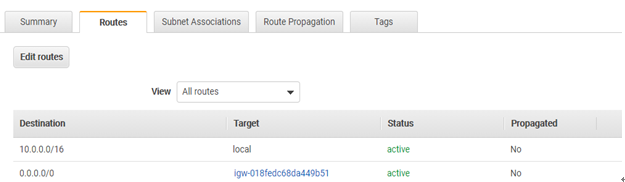 아래쪽 창에서 Routes탭을 클릭하고 igw로 설정되어 있는지 확인한다. 이 라우팅 테이블은 퍼블릭 서브넷에서 인터넷으로 통신 되도록 상용된다.
