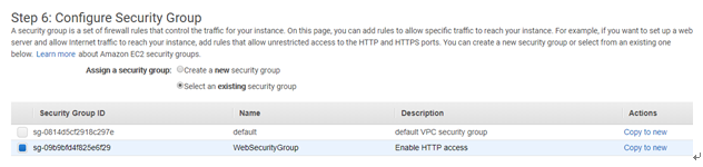 보안 그룹은 기본 값이 아닌 미리 만들어 둔 WebSecuriyGroup을 선택한다.