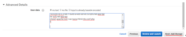 생성하자마자 바로 웹 페이지를 구축하기 위해 Linux 인스턴스에 php 웹 애플리케이션 설치하는 코드를 user data 상자에 입력한다.