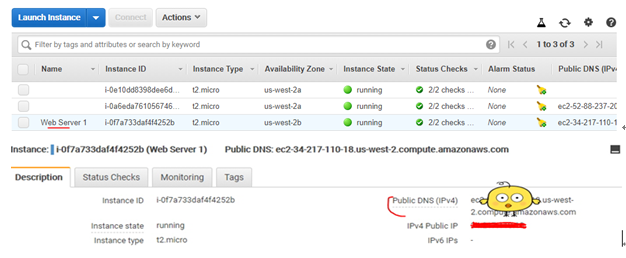 제일 아래쪽에 status를 보면 2/2checks passed가 나왔다. 무사히 생성되었음을 확인할 수 있다. 웹 페이지 동작을 확인하기 위해 선택한 후 밑에 설명에 public DNS의 주소를 복사하여서 웹페이지에서 열어 보았다.