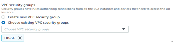 기존에 있는 VPC 보안 그룹 선택! DB-SG 추가하고 default값은 제거해야 한다.