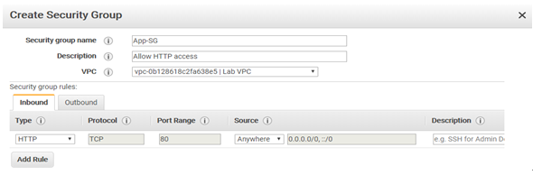 이름과 설명과 VPC를 설정하고 규칙을 추가한다. Add rules를 눌러 http를 허용한다. 소스는 위치 무관인 Anywhere로 설정하고 생성한다.