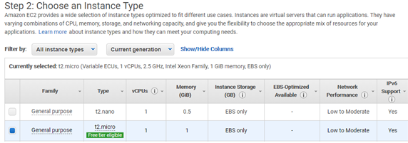 인스턴스 유형은 가상 CPU, 메모리, 디스크 스토리지, 네트워크 성능 조합을 할당한다. 이 App은 t2.micro 인스턴스 유형을 사용한다.