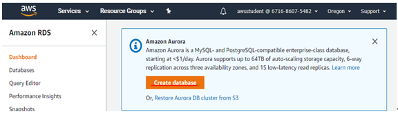 서비스 메뉴에서 RDS를 클릭한 후 대시보드에서 create database를 선택한다.