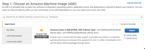 인스턴스 시작에 사용될 디스크 볼륨 사본이 있는 AMI를 선택할 수 있다. Linux 인스턴스를 생성하기 위해 Amazon Liunx2 이미지를 선택한다.