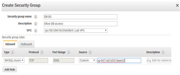 보안그룹을 하나 더 생성한다. 역시 이름과 설명과 VPC를 입력한다. inbound에서 규칙을 추가한다. MYSQL/Aurora를 선택 한 후 Source에 복사한 Group ID를 넣어준다. 한 보안 그룹이 다른 보안 그룹을 참조하는 기능이다. 즉 App-SG와 연결만 하면 추가 EC2 인스턴스가 데이터베이스에 엑세스 할 수 있게 된다. APP-SG와 연결된 인스턴스는 데이터베이스와 통신이 가능해지게 된다.