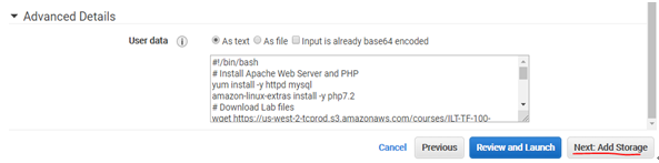 아래로 스크롤한 다음 고급 세부 정보를 확장한다. 사용자 데이터 필드가 나타난다. 인스턴스를 시작할 떄 User data필드를 통해 구성 스크립트를 전달 할 수 있다.