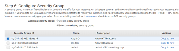 보안그룹은 인스턴스에 App-SG를 선택한다. (인바운드 규칙에 따라 인터넷 상의 모든 곳에서 오는 HTTP 트래픽이 허용된다.) Review and Launch 클릭!