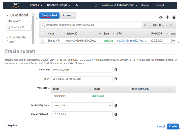 이름과 VPC와 가용영역과 IP범위를 설정한 후 생성한다. (10.0.0.0/24 대역)