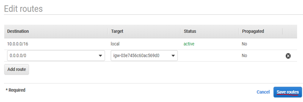 경로를 추가한다. 0.0.0.0/0 Target은 Internet Gateway 목록에서 Lab IGW를 선택한다.