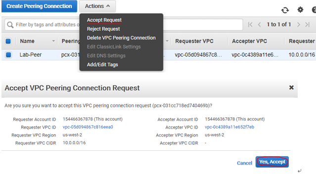 피어링 연결이 생성되면 대상 VPC의 수락을 받아야 한다. 대상 VPC를 다른 계정에서 소유하고 있거나 피어링 연결을 생성하는 사용자가 대상 VPC의 연결을 수락할 권한이 없을 수 있다. 생성한 Lab-Peer를 선택한 후 Actions에서 Accept Request으로 요청 수락!