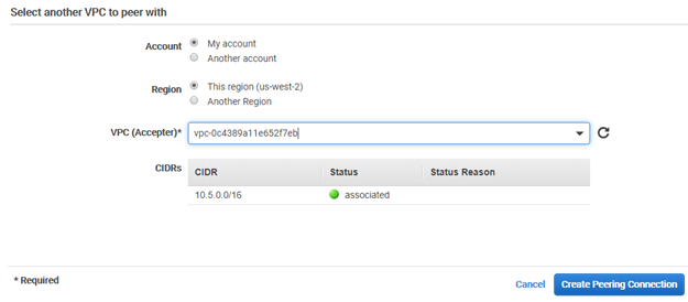 이제 두 VPC의 라우팅 테이블을 업데이트하여 Lab VPC에서 피어링 연결로 트래픽 전송!
