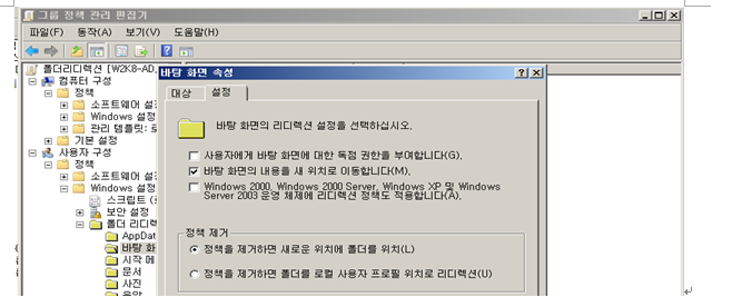 정책 편집을 하고 폴더리디렉션 설정을 맞춰준다. 그 후pc에 적용한다.